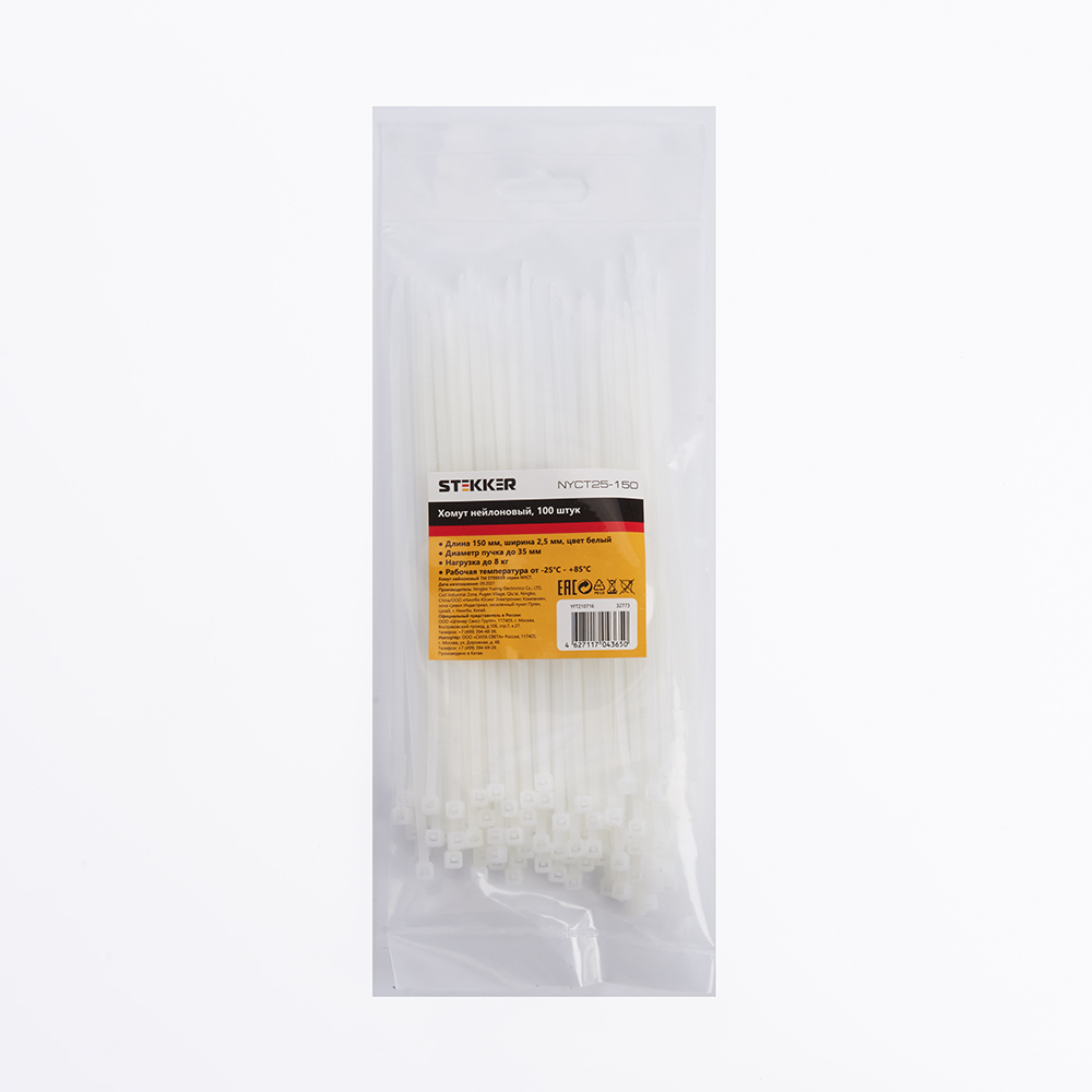 Хомут нейлоновый STEKKER NYCT25-150 2,5x150 мм, d пучка max 35 мм, нагрузка 8 кг, белый, упаковка 100 шт |