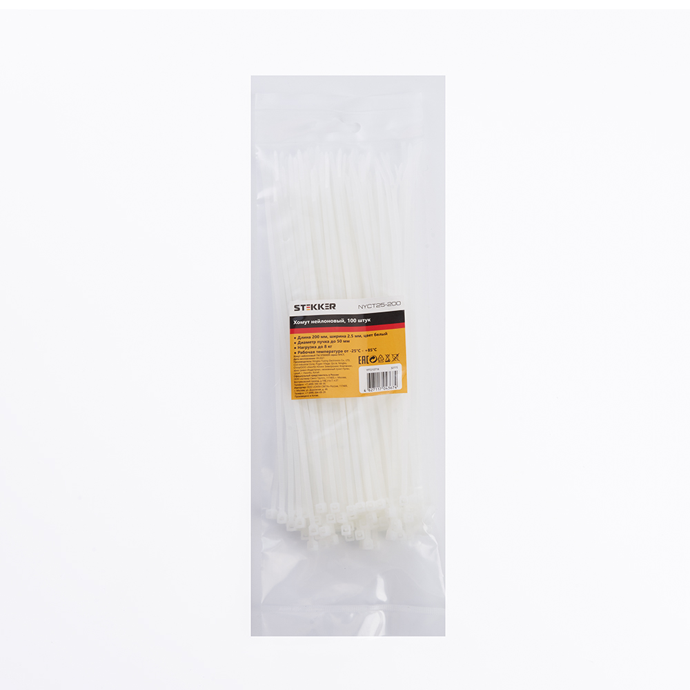 Хомут нейлоновый STEKKER NYCT25-200 2,5x200 мм, d пучка max 50 мм, нагрузка 8 кг, белый, упаковка 100 шт |