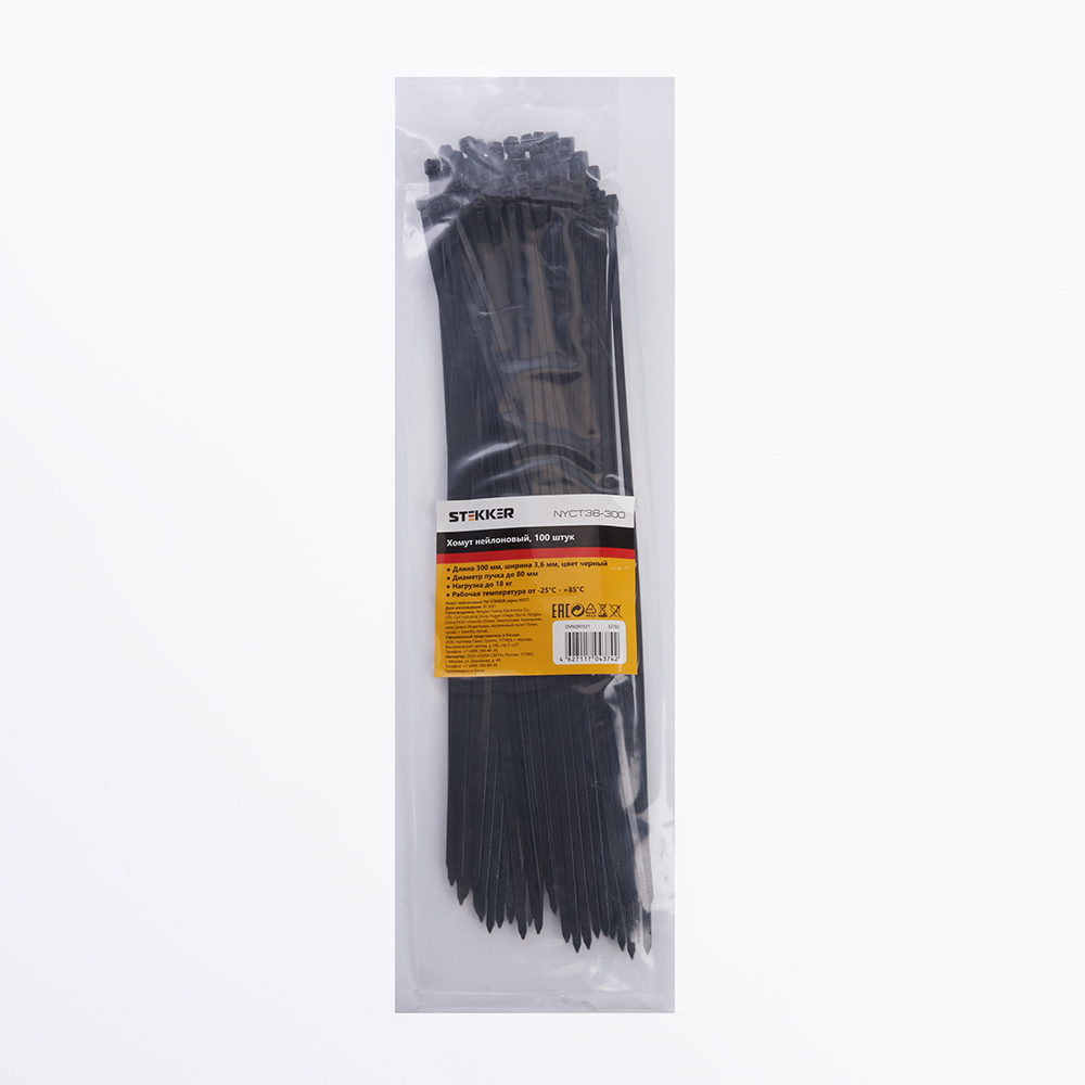 Хомут нейлоновый STEKKER NYCT36-300 3,6x300 мм, d пучка max 80 мм, нагрузка 18 кг, черный, упаковка 100 шт |