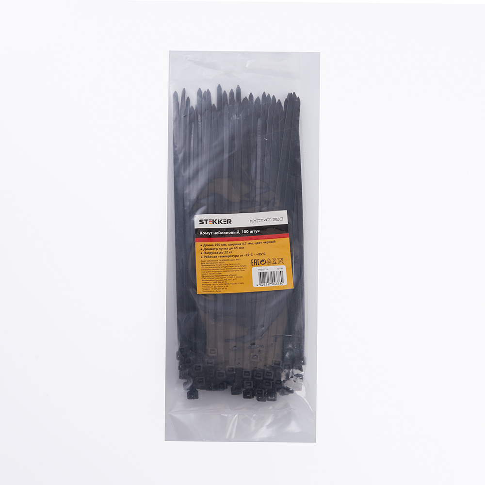 Хомут нейлоновый STEKKER NYCT47-250 4,7х250 мм, d пучка max 65 мм, нагрузка 22кг, черный, упаковка 100 шт |