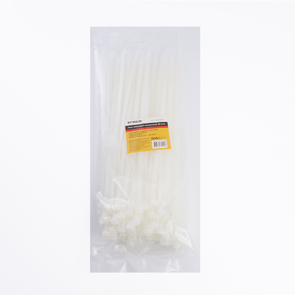 Хомут нейлоновый многоразовый STEKKER NYCT80-300 8x300 мм, белый, упаковка 100 шт |