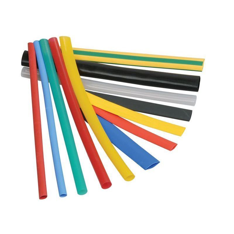 Наборы содержат тонкостенные термоусадочные трубки длиной 10 см или 8 см диаметром 2 мм, 4 мм, 6 мм, 8 мм, 10 мм, 12 мм и 14 желтого, желто-зеленого, синего, красного, черного и белого цветов. Наборы представлены в различных комплектациях по 10 и 20 трубок в наборе.