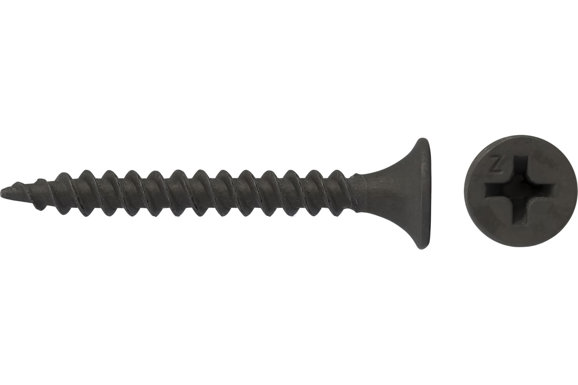 Материал сталь С1018. Покрытие черный фосфат. Частая двухзаходная резьба, голова рожковая потайная.