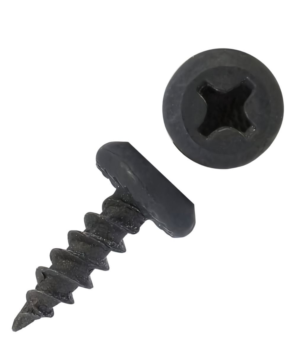 Материал сталь С1018. Покрытие черный фосфат. Частая двухзаходная резьба, голова рожковая потайная.